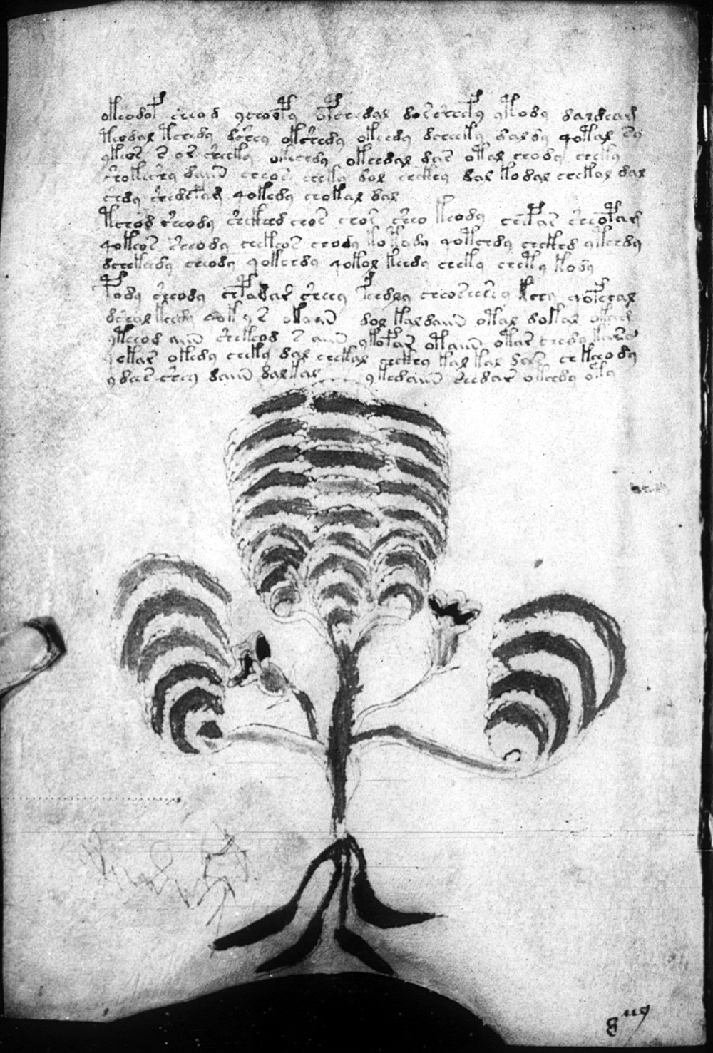There is a faint scribbling to the left of the root. It looks like an illegible word surmounted by a large EVA "l", followed by a very crude stick man with rectangular head and eyes, wearing two superimposed EVA "l"s as a hat.