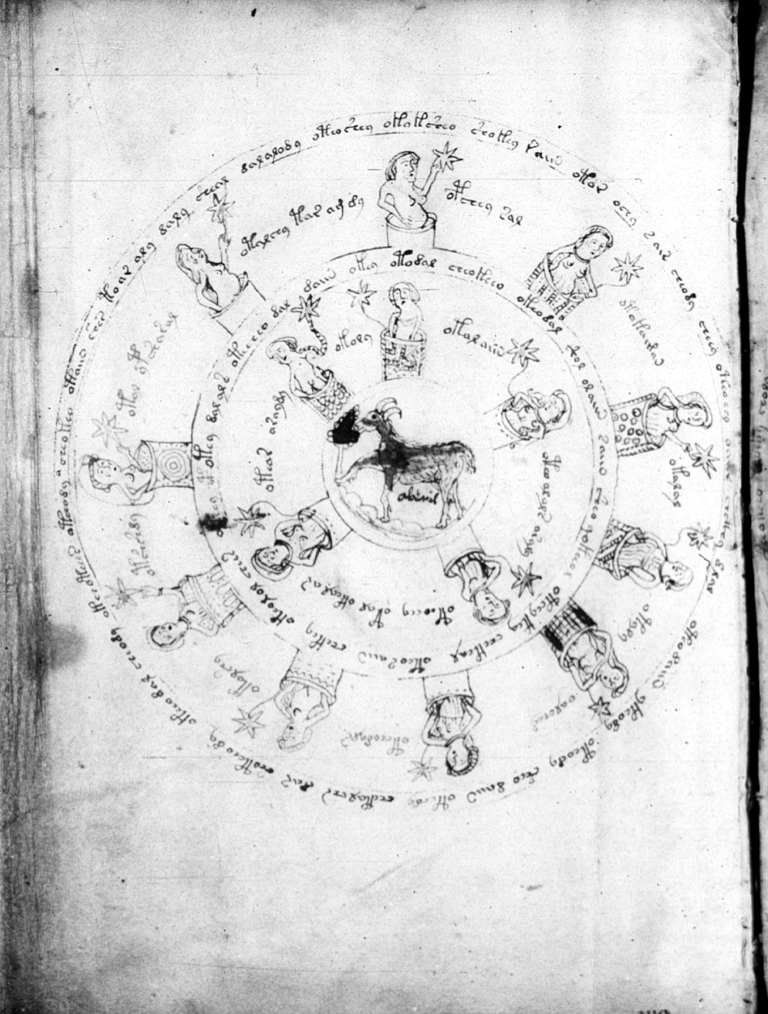 The central figure is widely believed to be a symbol of the sign Aries. The word below the animal could be "ab**il" in the Latin alphabet. It is traditionally read as some variant of the month name "April". Aries goes from ??? to ???.