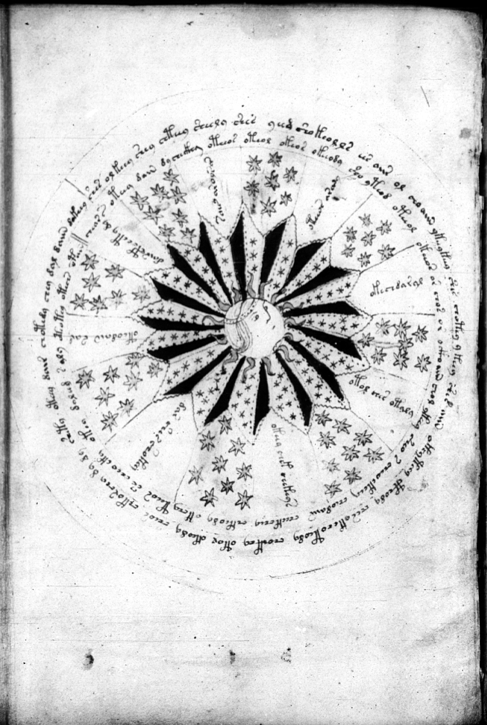 The whole is surrounded by another thin circle, about 1cm further out, that begins looking mechanically drawn but at some point wanders off and fails to close on itself, as if the fixed leg of the compass had skipped a bit. (However, this outermost circle may be a modern scribble on the copy.)