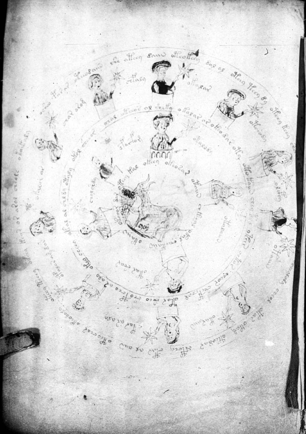 Between the middle ring and the outer ring are 10 human figures,
