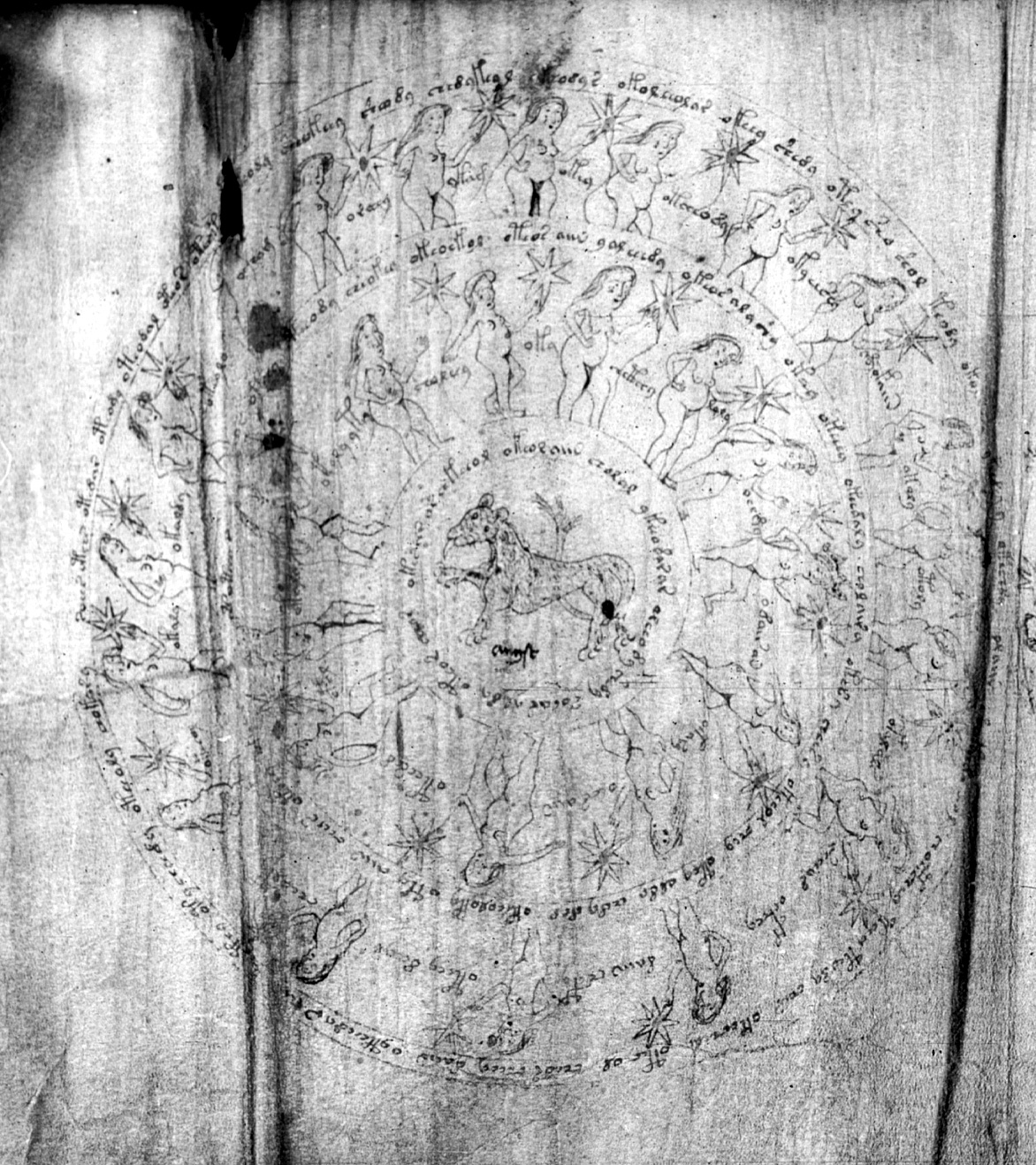 The three rings of text define two bands containing human figures